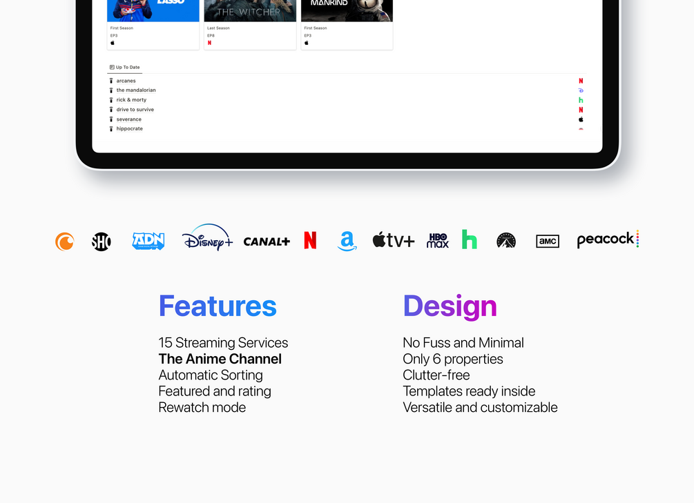 Our comprehensive manager makes it easy to track all of your TV shows in one place. You can see your up next, not started, finished, ended and even To Be Announced. Adding shows or streaming services is easy. It's versatile and highly customizable.