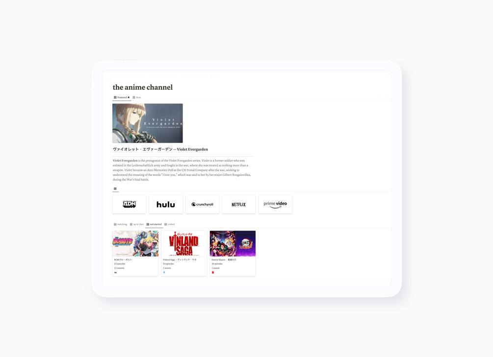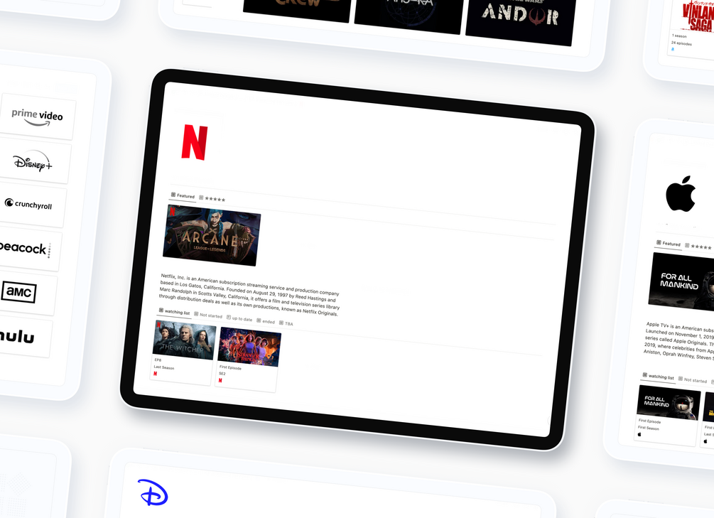 Our comprehensive manager makes it easy to track all of your TV shows in one place. You can see your up next, not started, finished, ended and even To Be Announced. Adding shows or streaming services is easy. It's versatile and highly customizable.